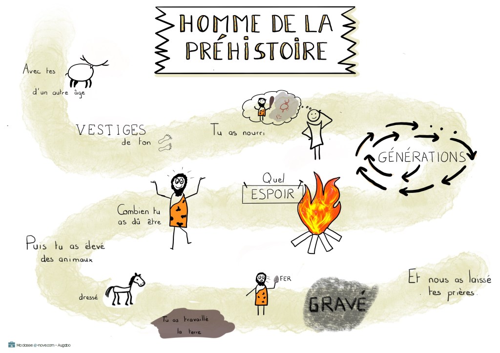 Voici une sketchnote que j’ai faite pour aider à la mémorisation de la poésie « Homme de la préhistoire ». Vous pouvez retrouver le texte de cette poésie sur le site de Bout de Gomme.