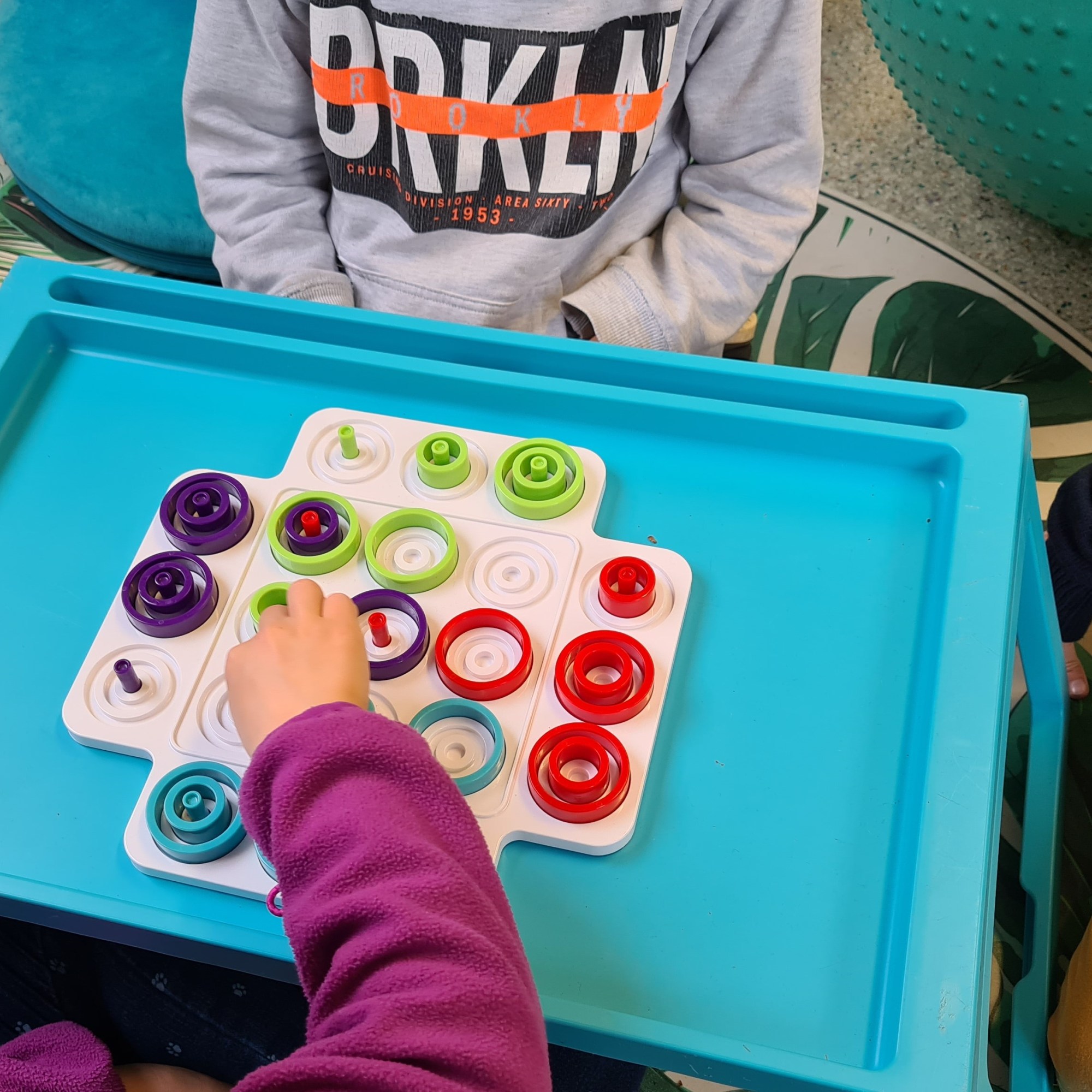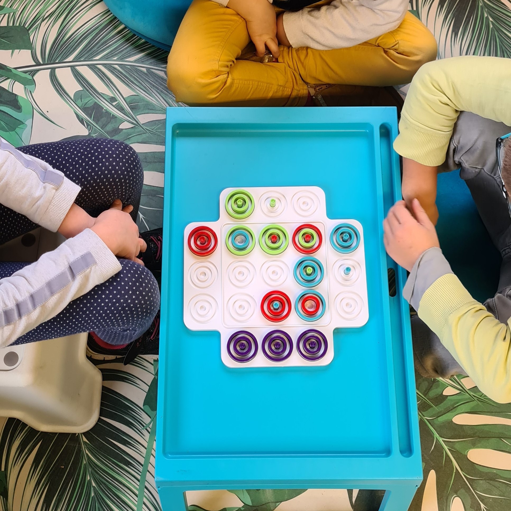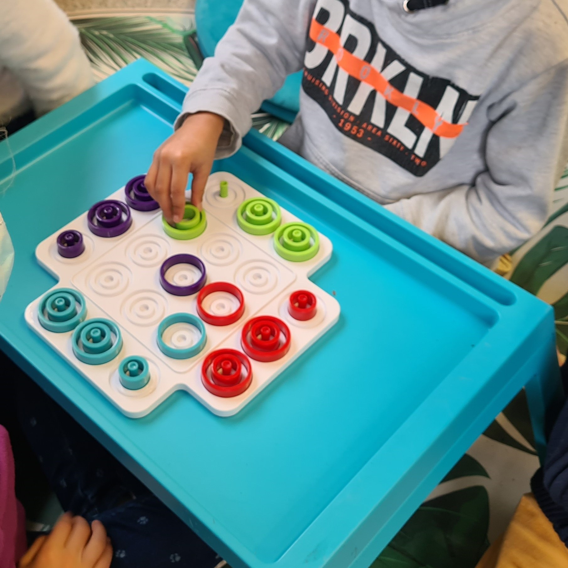 Je l’ai également proposé en classe sur un temps d’atelier avec mes CE1. J’ai prêté un exemplaire du jeu à une de mes collègues en CM1-CM2 qui l’a aussi testé chez elle et en classe. Je trouve plusieurs intérêts pédagogiques à ce jeu. En effet, Otrio permet de développer :